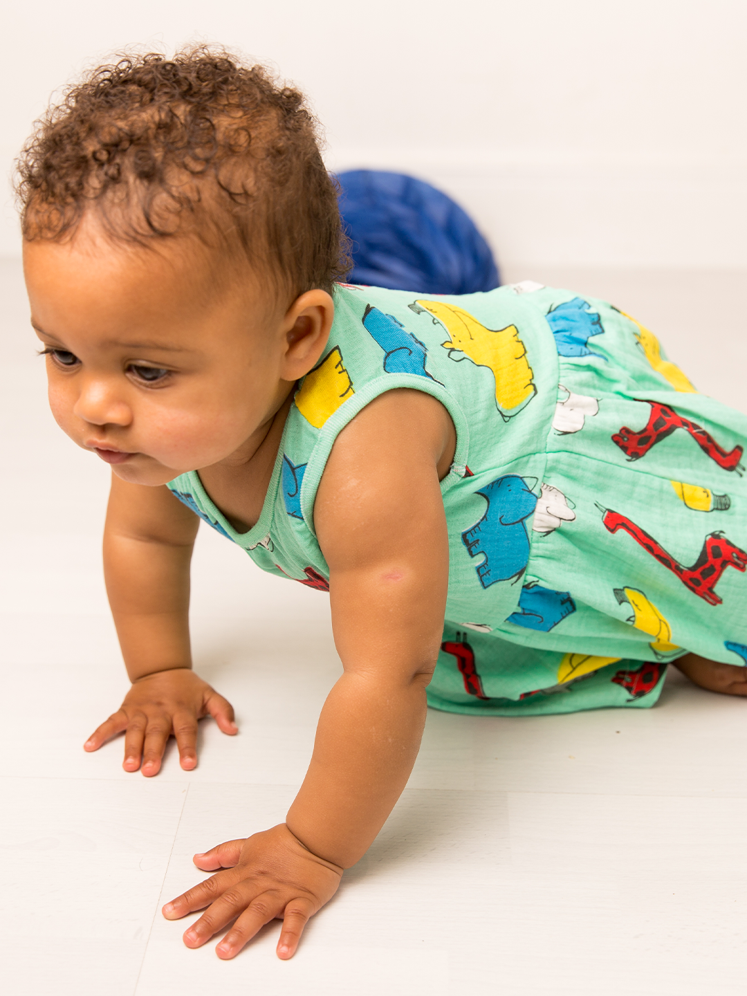 Soft cotton sleeveless dress with all over colourful animals printed on a soft green . Keep them cool and stylish this summer.