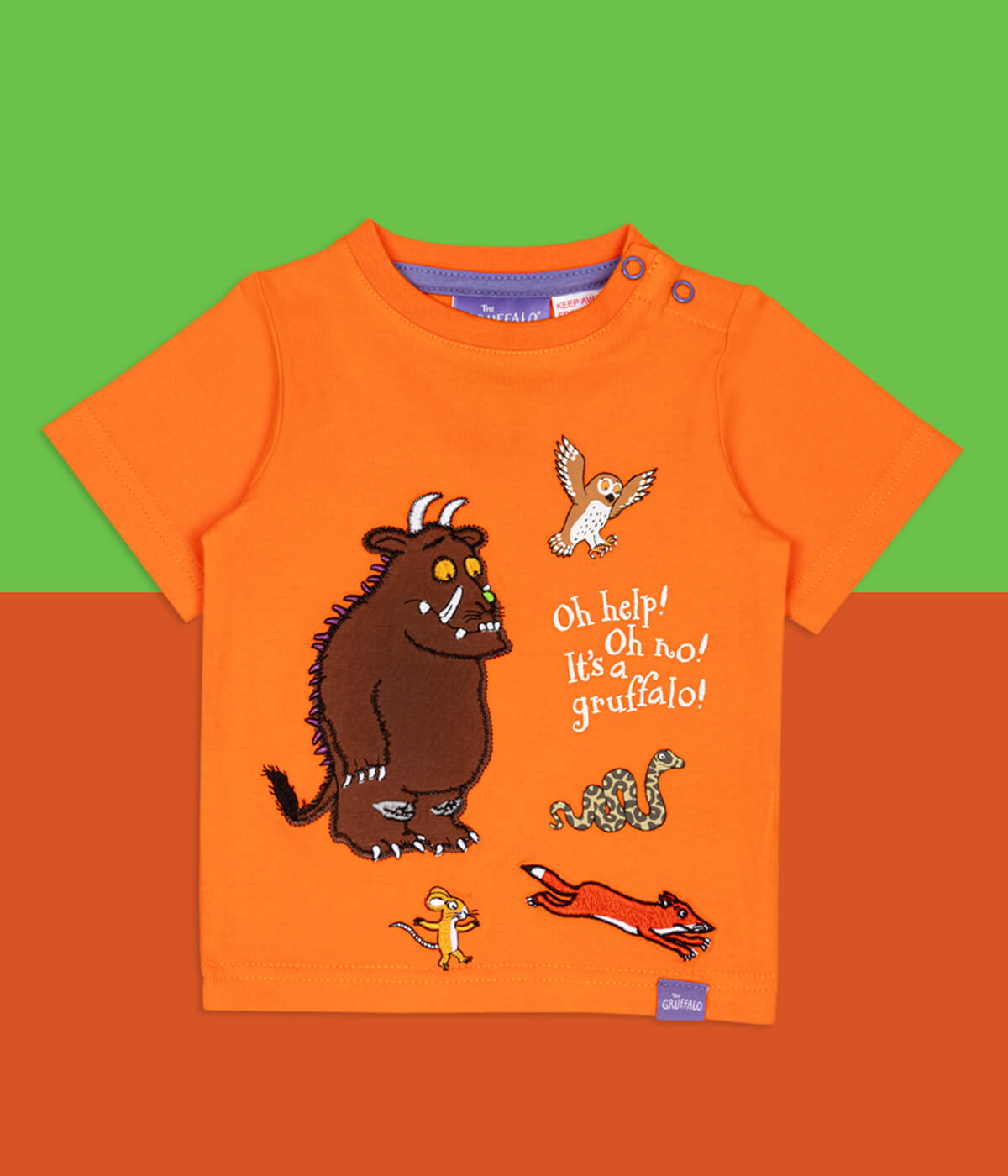 Unser Bestseller Gruffalo Outdoor Adventure CSammlung hat ein Sommer-Makeover bekommen. Ein leuchtend orangefarbenes T-Shirt mit der legendären Grüffelo-Figur und all seinen Freunden!