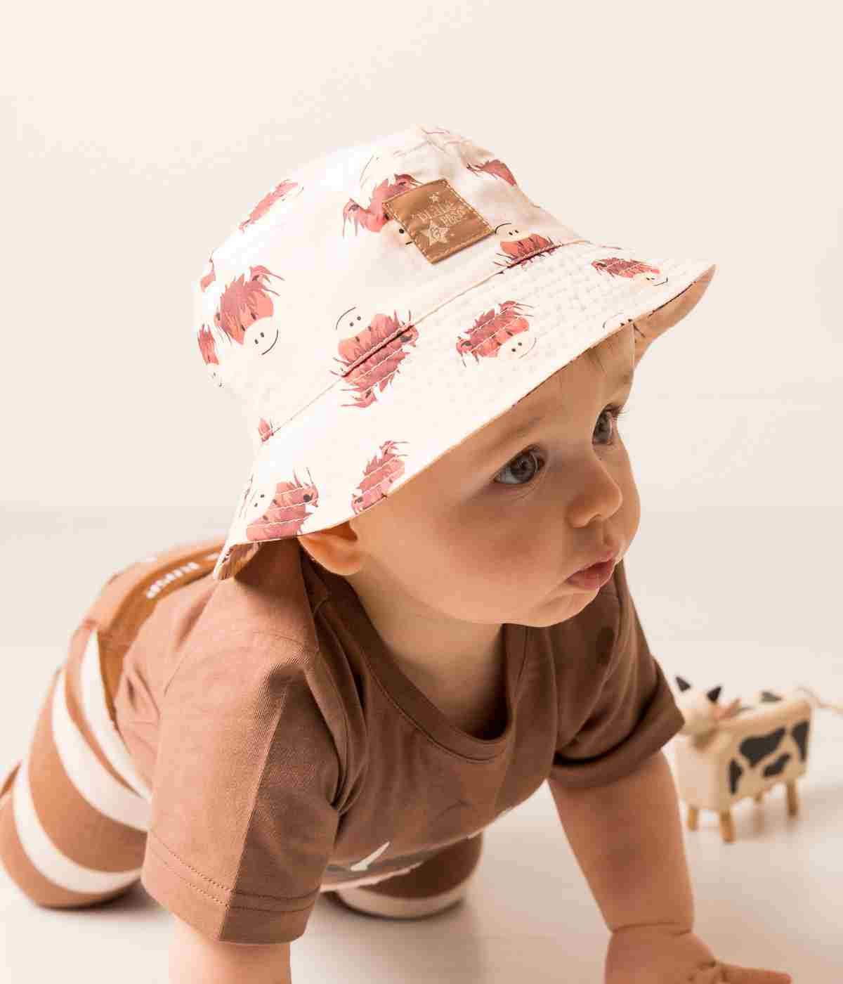 Super cute summer hat featuring adorable Neutral Highland Cow all over print! Perfect for sunny days out and will be a hit with any little ones!