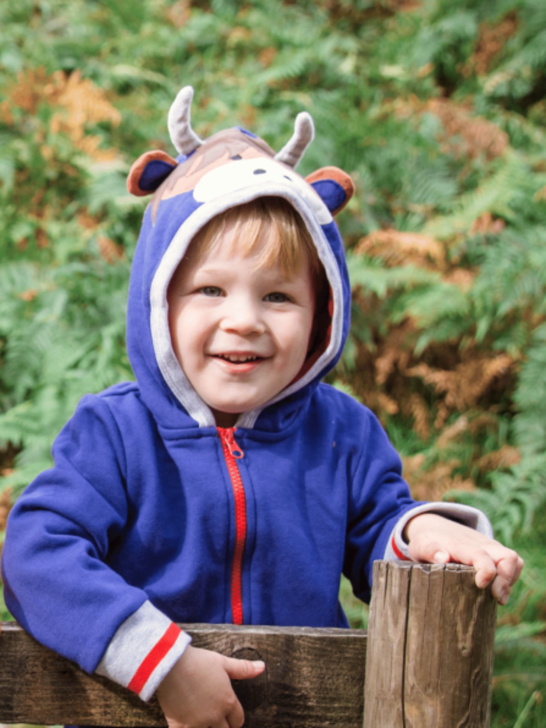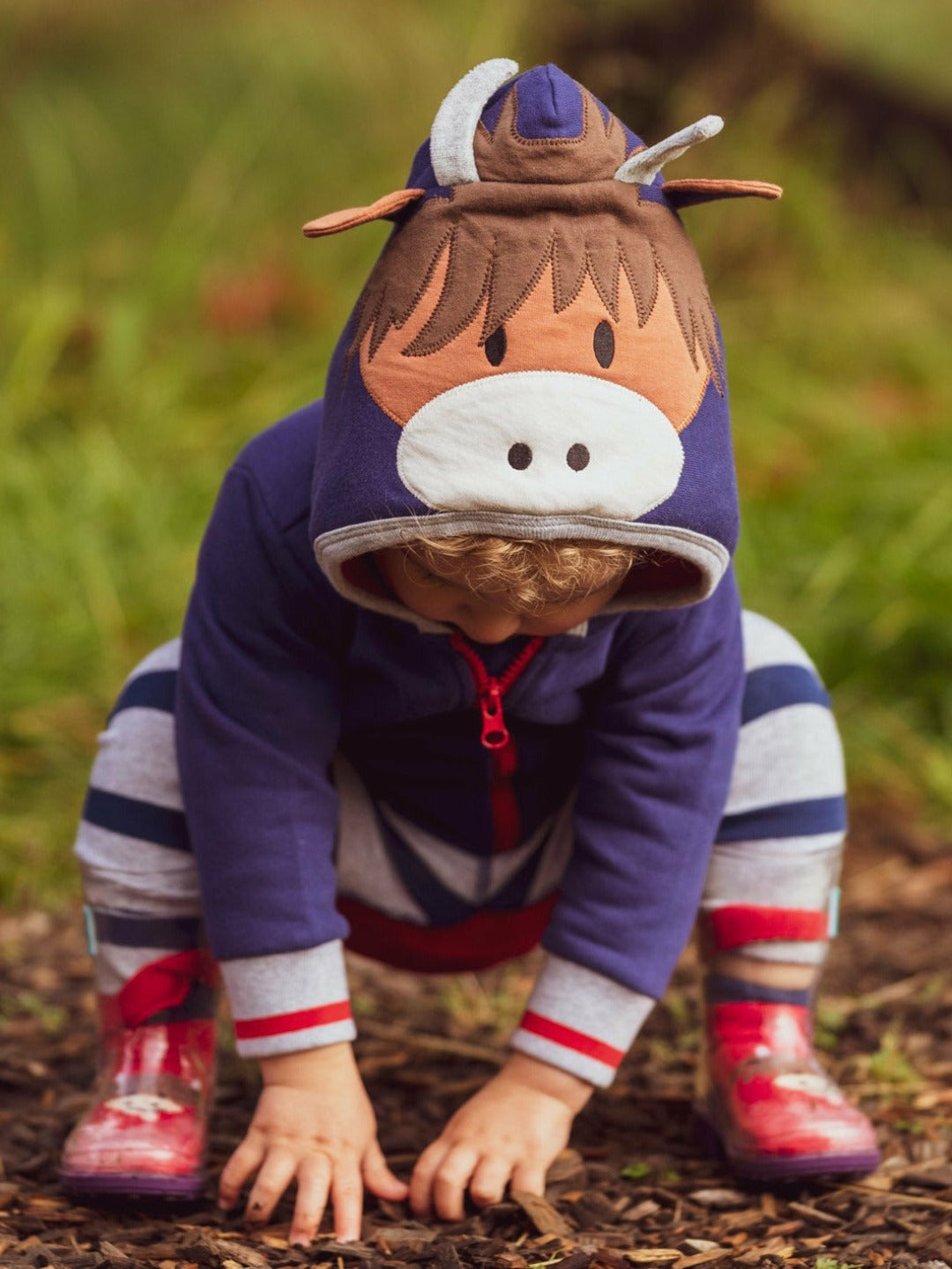 Nostro La felpa con cappuccio blu navy è caratterizzata dal nostro famoso muso di mucca delle Highlands con orecchie e corna vivaci. Ideale se al tuo piccolo piace distinguersi dalla massa o se ama tutto ciò che ha a che fare con la natura!
